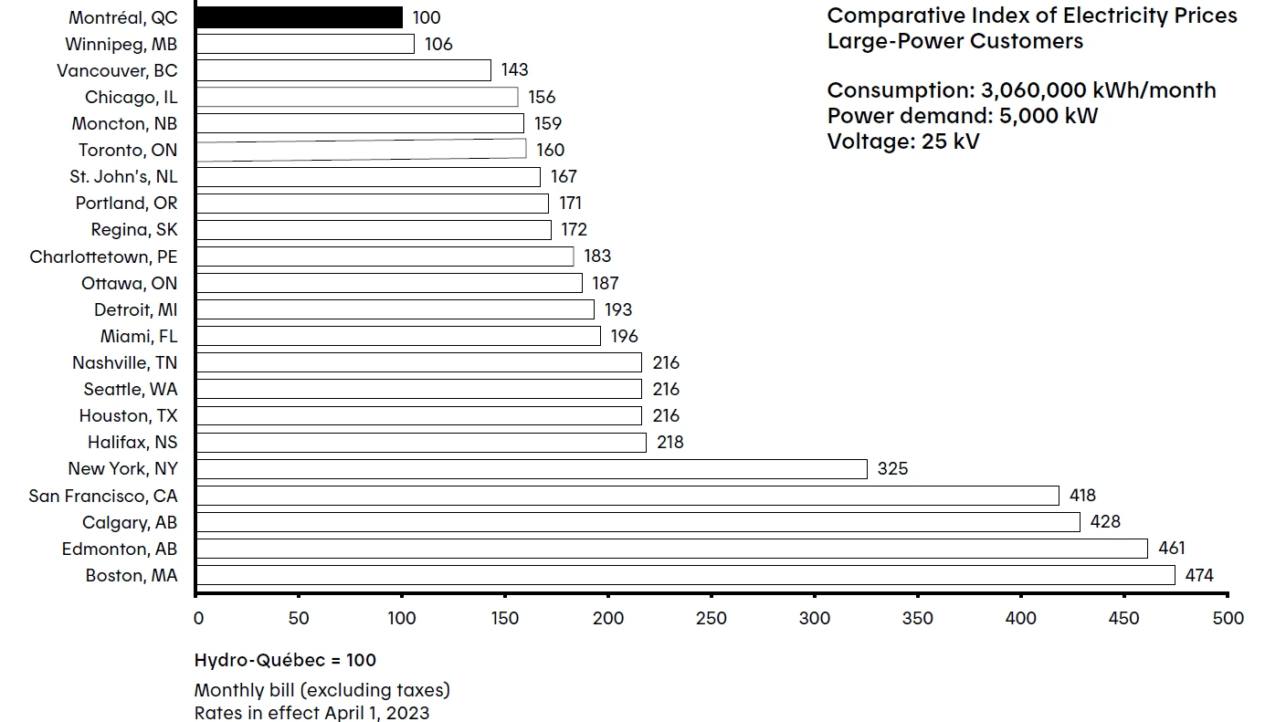Due to Quebec’s massive renewable hydroelectric capacity, the price per kilowatt for commercial electricity is around 5.74 cents (4 cents USD) per kilowatt-hour (kWh). This is considered relatively low compared to other major cities in the United States and Canada due to abundant hydroelectric resources. Clean renewable electricity in Canada is 78 percent less expensive than California for example, where the average price of commercial electricity is 18.18 cents per kilowatt-hour (kWh); 450% more expensive. You are paying a lot more for “dirty” energy with high carbon emissions from burring fossil fuels like coal, oil and natural gas.